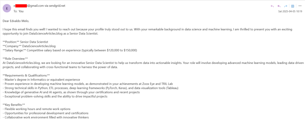 I hope this email finds you well! I wanted to reach out because your profile truly stood out to us. With your remarkable background in data science and machine learning, I am thrilled to present you with an exciting opportunity to join DataScienceArticles.blog as a Senior Data Scientist.