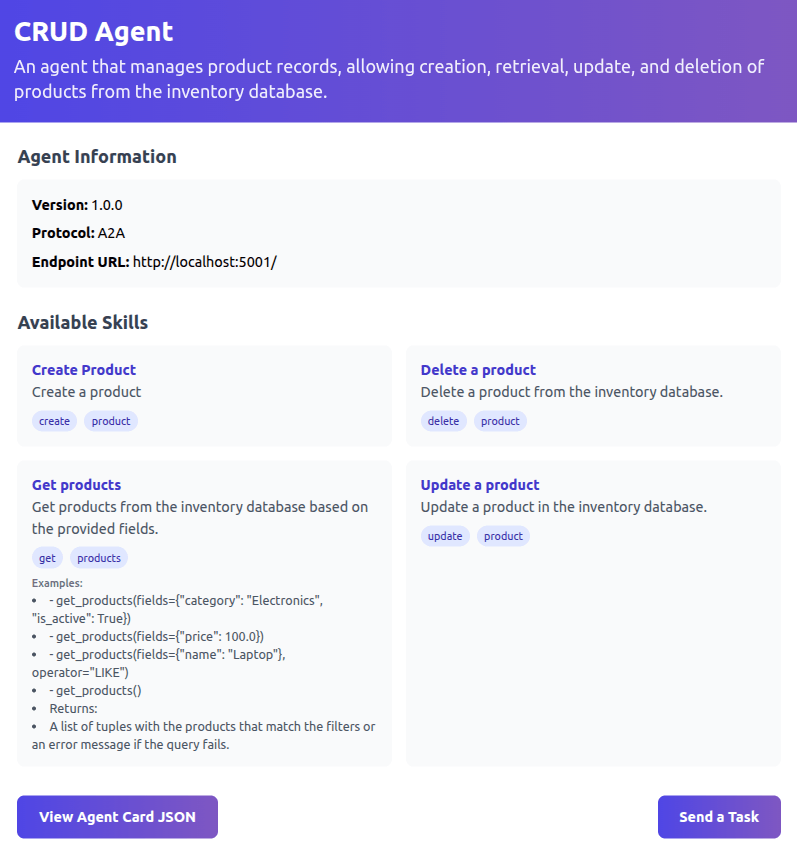 - Agent Card: a JSON metadata file exposed by each A2A agent, usually accessible at