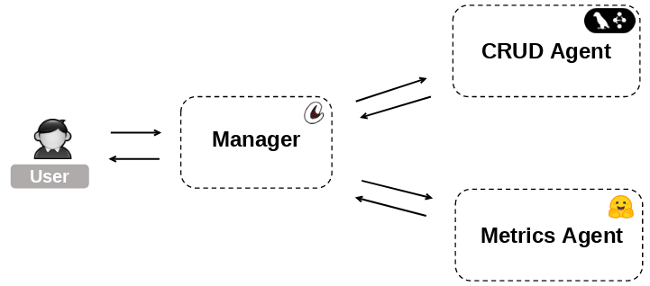 The image below illustrates the flow of this use case. The client — in this case, the user — sends a request, which is first analyzed by the manager (CrewAI). The manager is responsible for delegating the request to the most suitable agent to handle it. In this scenario, there are 2 agents: the CRUD agent (LangGraph), responsible for create, read, update, and delete operations, and the metrics agent (Smolagents), responsible for performing metric calculations.
