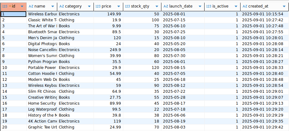 INSERT INTO products (name, category, price, stock_qty, launch_date, is_active)