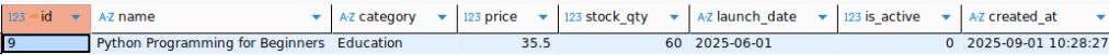 To validate, by running the query SELECT * FROM products WHERE id = 9; you will see that the category is now “Education” and the product is no longer active.