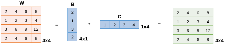 LoRA (Low-Rank Adaptation), on the other hand, aims to reduce the number of parameters that need to be trained by applying a low-rank matrix decomposition. In this context, the rank represents how many independent rows or columns a matrix truly has, that is, its essential complexity. This allows a large matrix to be approximated by the multiplication of 2 smaller matrices. Below, I show an example where a 4×4 matrix is represented using 2 smaller matrices: one of size 4×1 and the other of size 1×4.