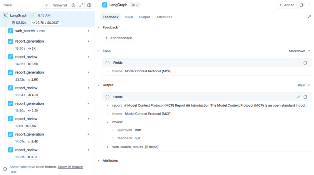 Notice that the three defined nodes are executed initially. From the review step onward, however, the flow starts iterating between the report generation and review nodes. This happens because the reviewer does not approve the initial version and requests improvements, causing the graph to return to the generation node. This cycle repeats a few times until the state indicates approval (review["approved"] == True), at which point the flow is finalized.