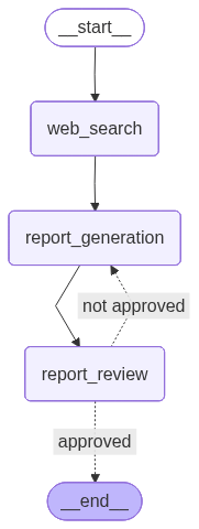 StateGraph: the class responsible for defining the graph. Here, we specify the state schema (in this case,ReportState), which represents the shared data structure across all nodes in the workflow.add_node: method used to add nodes to the flow. Each node is identified by a name and associated with a function that will be executed at that point in the graph. In this example, the nodes are mapped to the functionsweb_search,report_generation, andreport_review.add_edge: method responsible for defining the execution flow between nodes. The graph starts atSTART, which represents the entry point, then moves to the web search node, followed by report generation and review.add_conditional_edges: method used to create branching in the flow based on a condition. In this case, after the review node executes, a lambda function analyzes the state and returns a route identifier ("approved"or"not approved"). This value is then mapped in thepath_mapto determine the next step: finish the graph (END) or return to the report generation node. This is where the loop is created, enabling iterative refinements until the report is approved.compile: converts the graph definition into an executable structure, allowing it to be run using theinvokemethod.